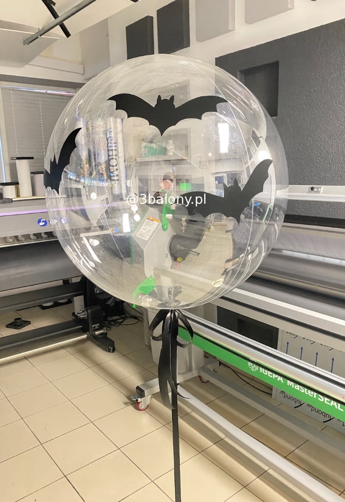 • 1 x balon przezroczysty Bubble z nietoperzami (różne wielkości – naklejki) z helem + wstążka ~1,5 m.