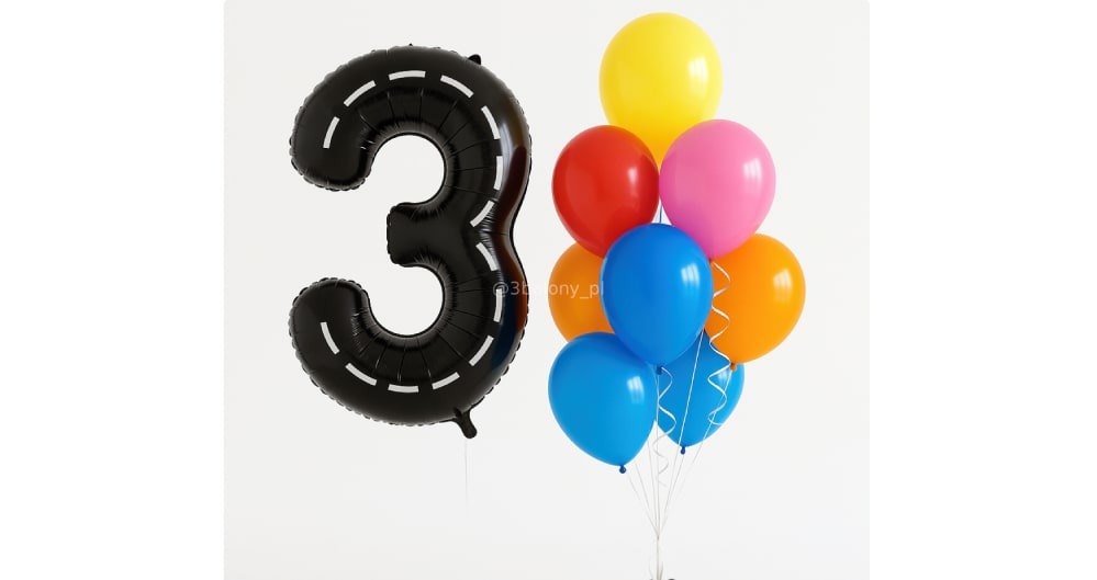 • 1 x balon foliowy cyfra 3, kolor czarny + białe paski, rozmiar 90 cm z helem;