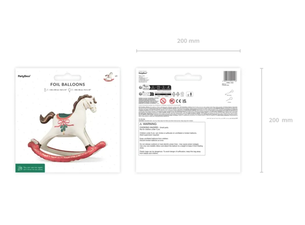 • 1 x stojący balon foliowy Koń świąteczny, mix kolorów, wymiary przed napompowaniem ok. 118 cm x 104 cm (46.5 x 41”), wymiary po napompowaniu ok. 106 x 86 cm (41.5 x 34”). Do napompowania powietrzem. Zestaw zawiera słomkę.