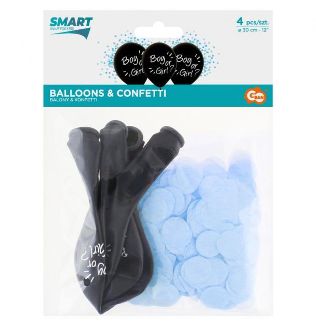 • 1 x balon gumowy boy or girl (niebieskie konfetti), rozmiar 30 cm z helem + wstążka.