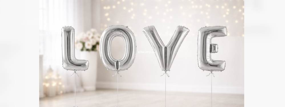 • 1 x balon foliowa litera „L” „O” „V” „E”, kolor srebrny, rozmiar 100 cm z helem + wstążki.