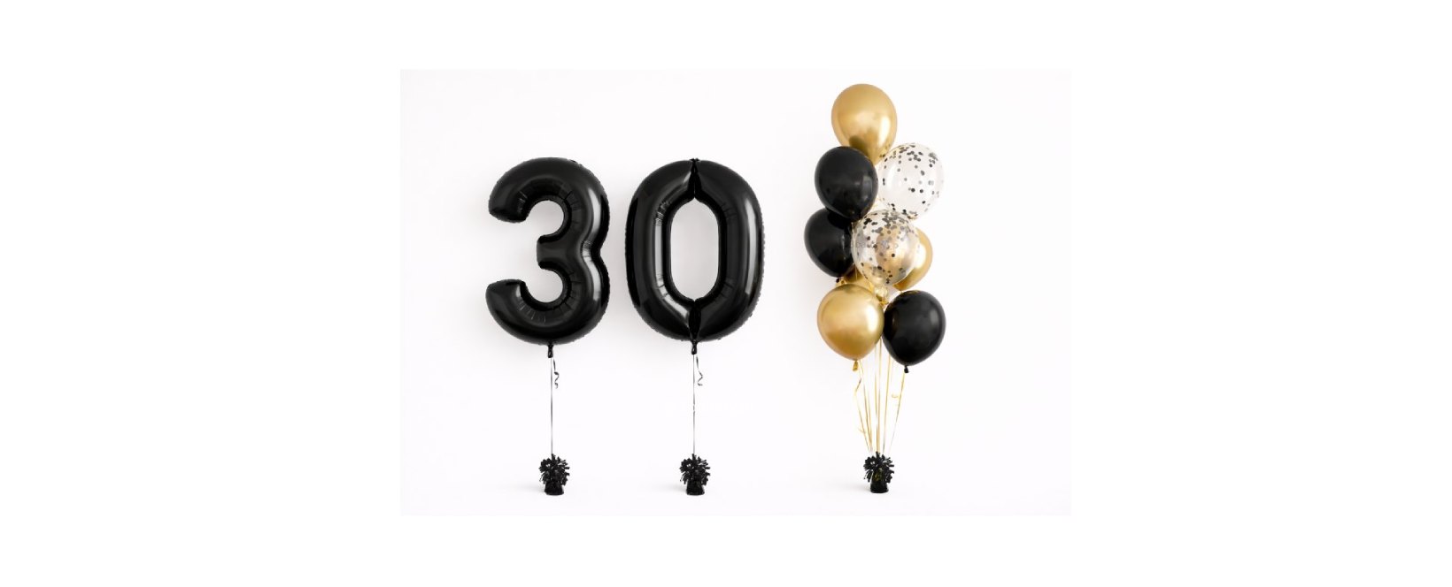 Elegancki bukiet balonowy w kolorach czarnym, złotym i transparentnym z konfetti to stylowa dekoracja na urodziny lub jubileusz. W zestawie znajdują się duże balony foliowe w kształcie cyfr 3 i 0 (90 cm) wypełnione helem. Całość uzupełnia kompozycja balonów lateksowych, która tworzy efektowną i nowoczesną dekorację.