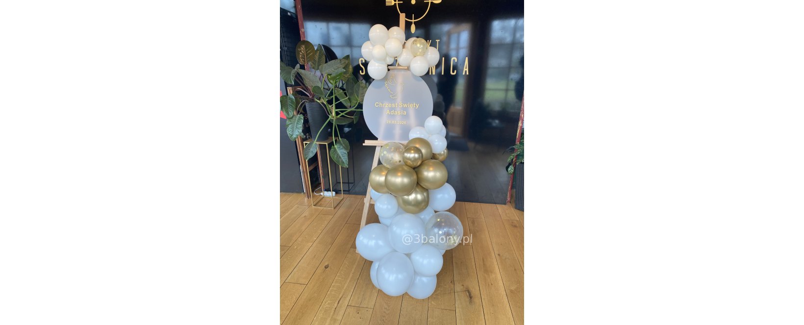 • 1 x drewniana sztaluga w wysokości 170 cm, udekorowana balonami gumowymi w dwóch kolorach + przezroczyste z konfetti (zwrotna);