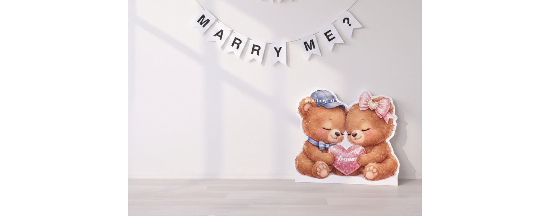 Dekoracja wieloformatowa wycięta po obrysie przedstawia dwa pluszowe misie trzymające serce z napisem lub bez, utrzymane w ciepłej kolorystyce. Produkt o szerokości 50 cm idealnie nadaje się do ekspozycji w witrynach sklepowych, punktach handlowych, salach okolicznościowych lub jako element dekoracji eventowej. Precyzyjne cięcie podkreśla kształt grafiki, nadając jej estetyczny i efektowny wygląd z każdej perspektywy.